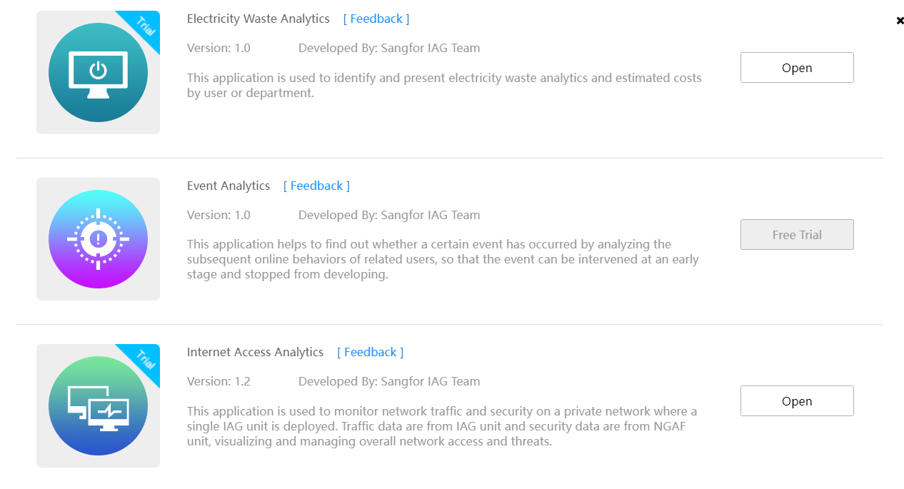 Based on a new architecture of the original Sangfor IAG External Report Center and massive Internet access logs, Sangfor Business Intelligence takes various App stores as carriers to offer various business intelligence Apps for assisting troubleshooting and analysis.