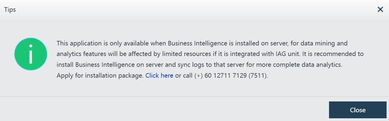 Click and a Tips dialog box will appear, providing the contact information to apply for a free trial of more apps.