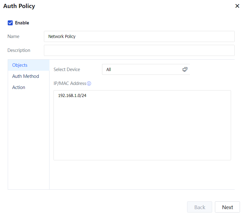 Step 1.Choose Access Mgt > Authentication > Web Authentication > Authentication Policy [LCH359]and set an authentication policy. [A360]Set the objects to 192.168.1.0/24.