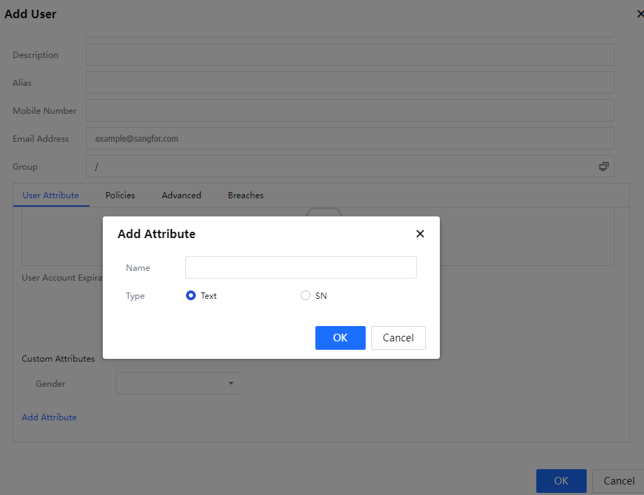 Configuration Example 1: Configuring user-defined attributes. When the existing attributes are not enough, you can add user-defined attributes for users and use the attributes to set Internet access policies and traffic control policies for the users with the same attributes.