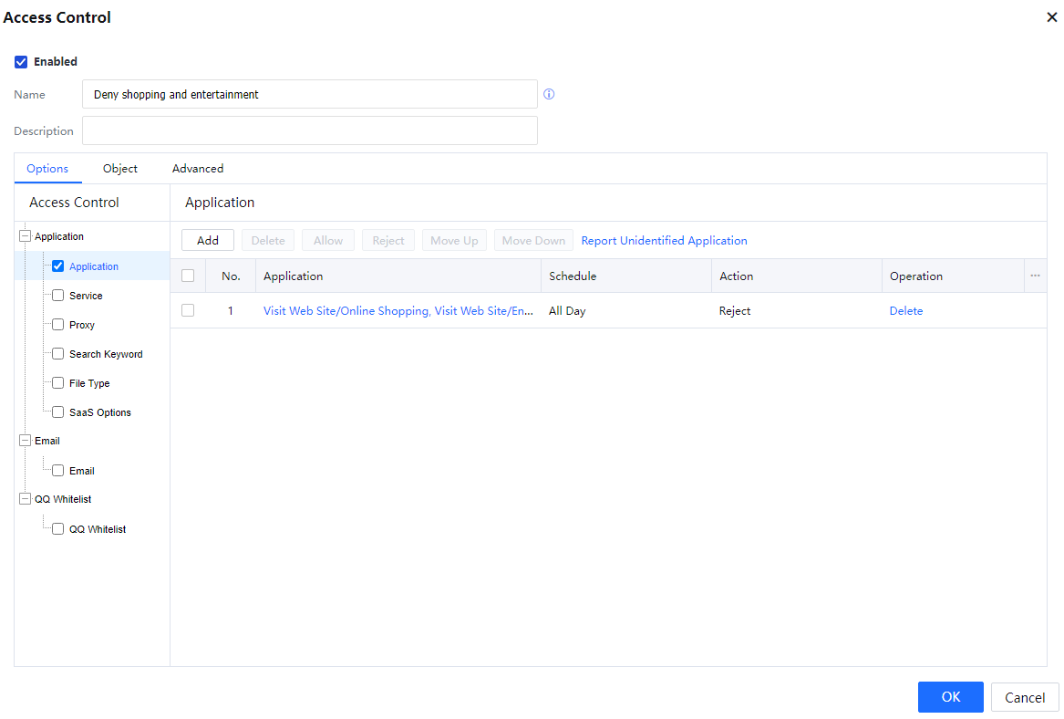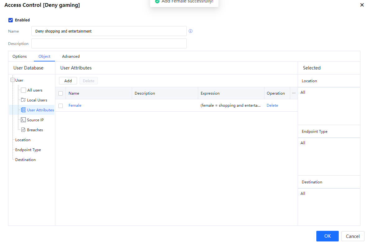 Step 5.For female users, configure the Internet access policy to disallow them from accessing shopping and entertainment websites.