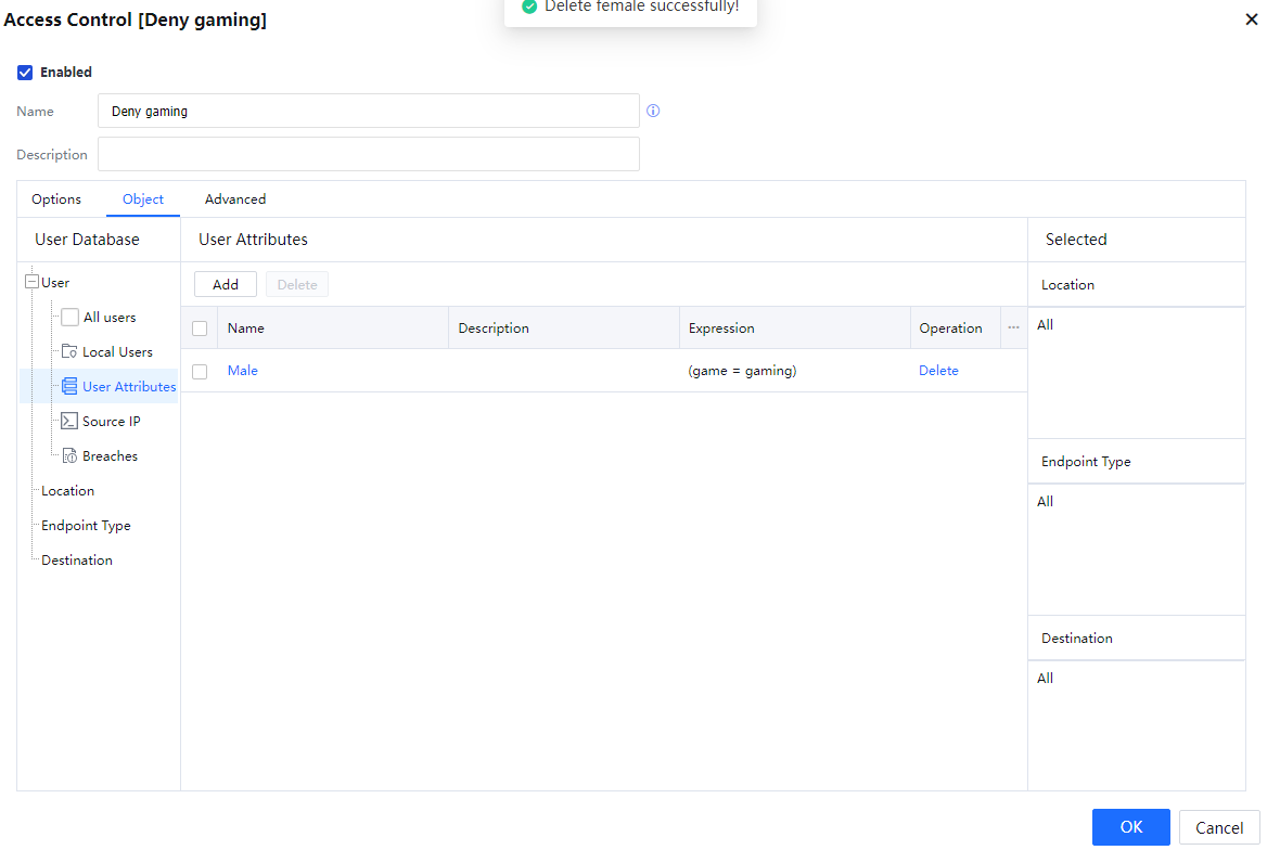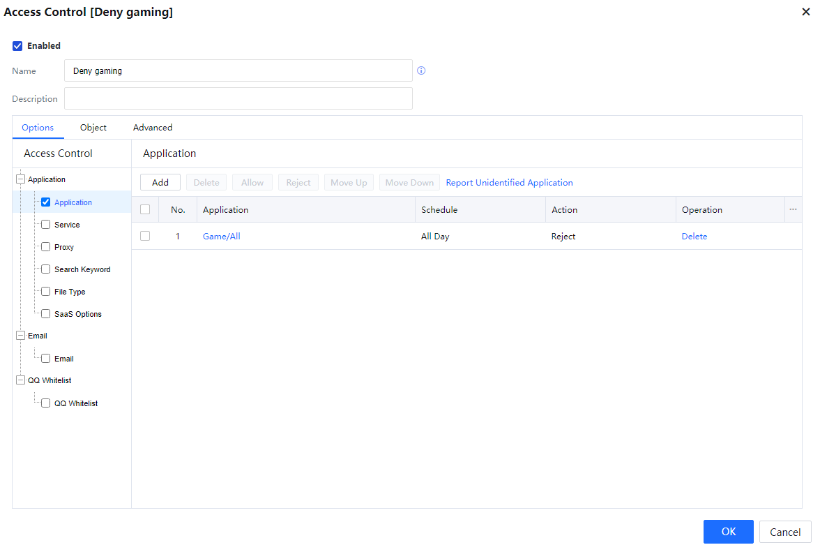 Step 6.For male users, configure the Internet access policy to disallow them from using gaming applications.
