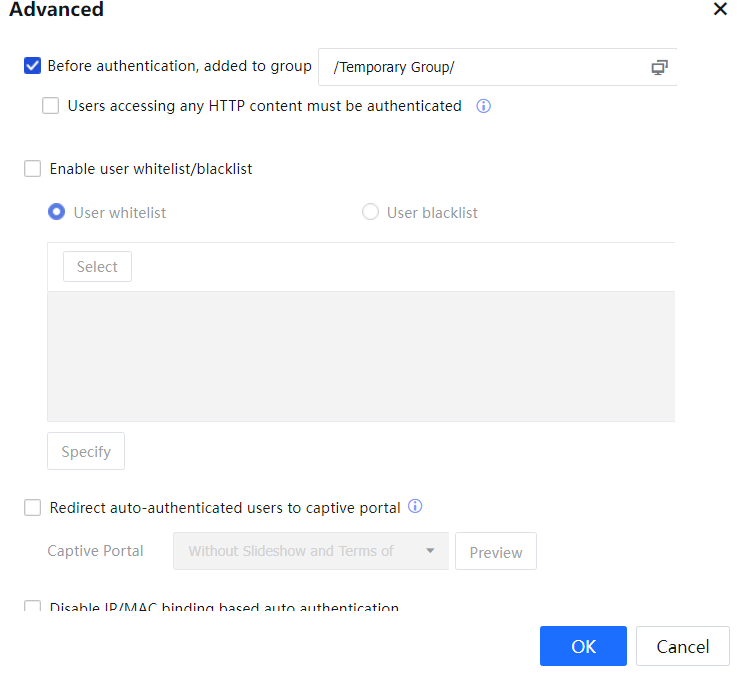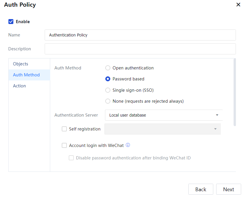 Choose Access Mgt > Authentication > Web Authentication > Authentication Policy and click Add to add an Internet access policy. Associate the policy with the Temporary Group.