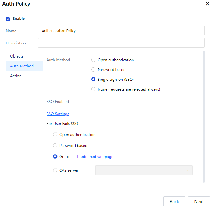 Set Authentication Method to SSO. Select Predefined webpage for users who fail to be authenticated during SSO.
