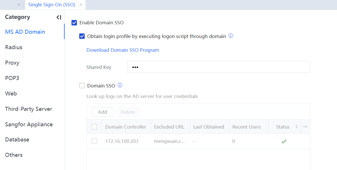 Select Obtain login profile by executing logon script through domain, which indicates the SSO is implemented by delivering the login script. Enter the shared key in Shared Key. See the following figure.