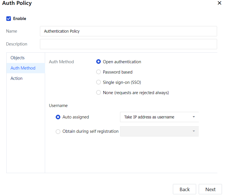 In Authentication Method, select Open Auth and set Take IP address as username.
