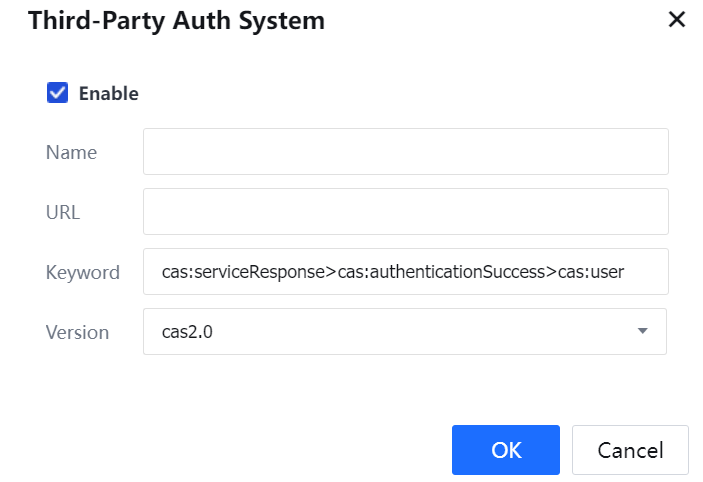 Step 3.Add a third-party auth system in Access Mgt > Authentication > Web Authentication > Authentication Server, and c[A362]onfigure relevant parameters. Specify a name for the new authentication system, set the URL to the one obtained in Step 1, keep the default keyword value, and select cas2.0 in the Version field.