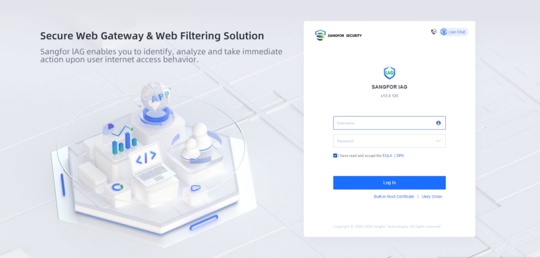 After finishing all the wiring, you can log into the Web User Interface (UI) to configure the Sangfor IAG device. Follow the procedures below to log into the console of the IAG device: