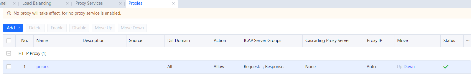 Proxies fall into three categories: HTTP proxy, SOCKS4 proxy, and SOCKS5 proxy, to meet various requirements. On the Proxies page, you can perform the following operations: Add, Delete, Enable, Disable, Move Up,and Move Down.