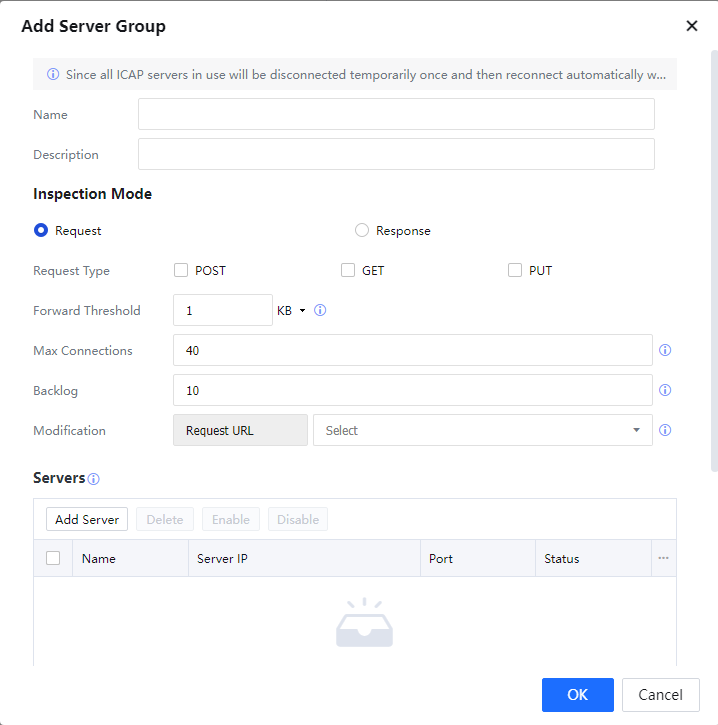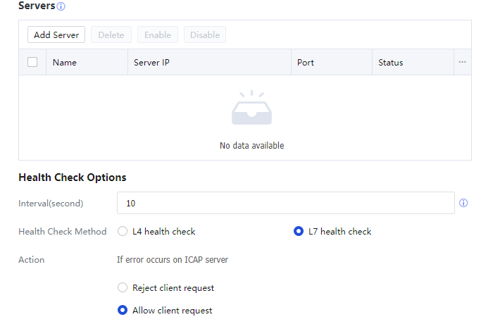 You can configure 32 ICAP servers for each ICAP server group and perform operations against an individual server, such as enable, disable, and delete. The Status column displays the status of individual ICAP servers, enabled or disabled.