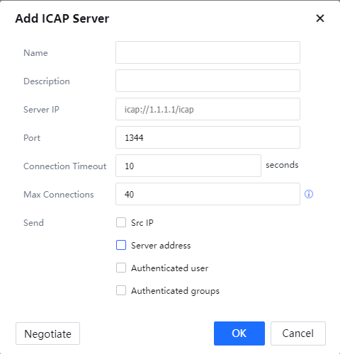 Negotiate: Click Negotiate to test the validity of the ICAP server and negotiate parameters with that server.