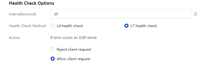 Action: Specify the action to be performed if an error occurs on the ICAP server. Valid values: Rejects client request and Allow client request.