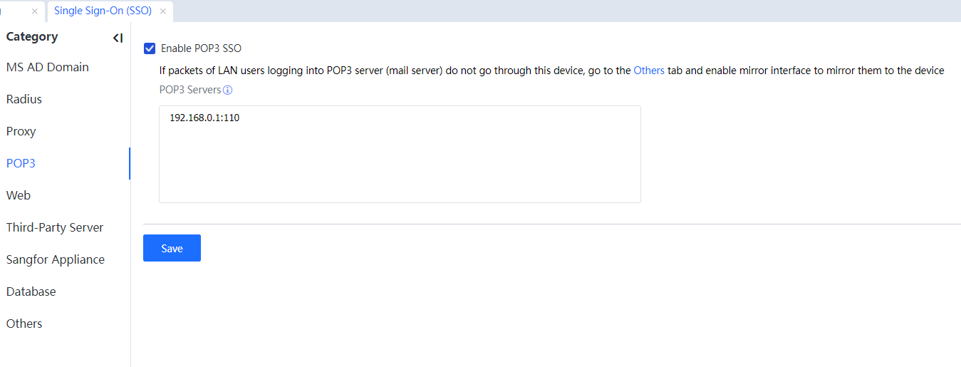 A customer's network includes a mail server; user information is stored in a POP3 server. Before accessing the Internet, users use clients such as Outlook and Foxmail to log in to the POP3 server to send or receive mail. When user login information is detected in monitoring mode, the device identifies and authenticates the users so that the users do not need to enter usernames and passwords again. It applies to scenarios where the POP3 server is deployed within or out of the intranet. The POP3 SSO configurations for these two deployment modes of the POP3 server are described as follows: