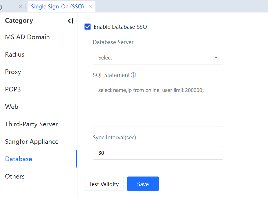 Suppose a database system is deployed for storing and managing user authentication information and the organization structure. In that case, SQL statements can be configured on the Sangfor IAG to query the user list, authenticate users from the database system, and synchronize the information to the local organization structure and online user list by implementing SSO by working with the database system. After a user is authenticated in the database, the user is automatically authenticated on the IAG. When the user is logged out of the database, the user is also logged out of the IAG. Currently, the supported database types include Oracle, MS SQL Server, DB2, and MySQL. See the following figure.