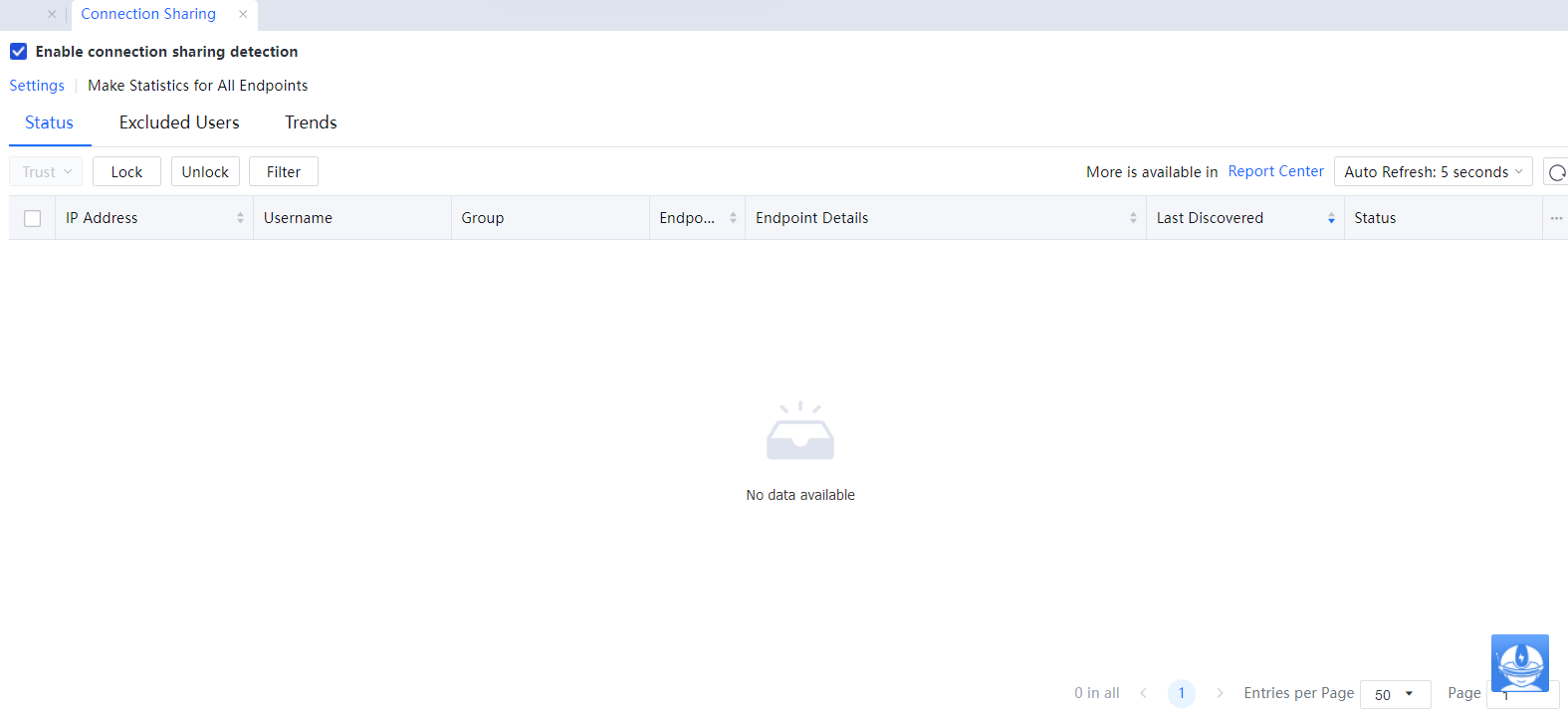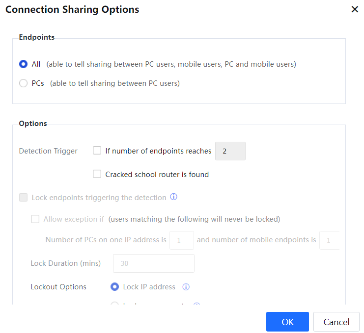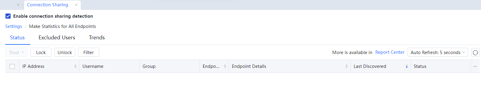 Step 1.Navigate to Endpoint Mgt > ConnectionControl > Connection Sharing. The Connection Sharing page is displayed on the right. Select Enable connection sharing detection. See the following figure.