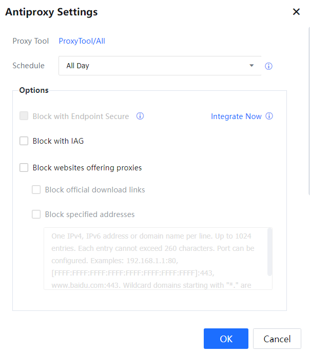 By default, Proxy Tool/All is selected for Proxy Tool. You can select proxy tools as per your need. To block specified proxy tools, select the option Block proxy tools. Select the option Give alert to user to alert the user when the use of the specified proxy tool is detected.