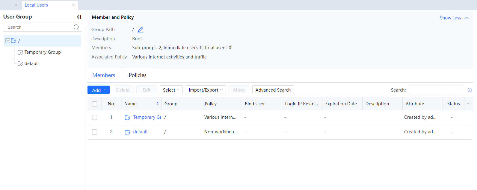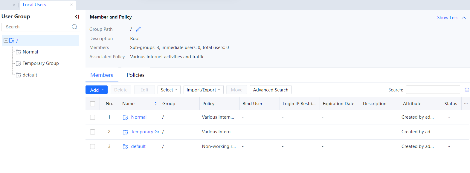 Step 3.Add a common employee group and a director group for local users at Access Mgt > User Management > Local User > Add Group/User.