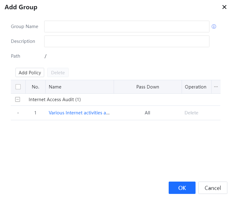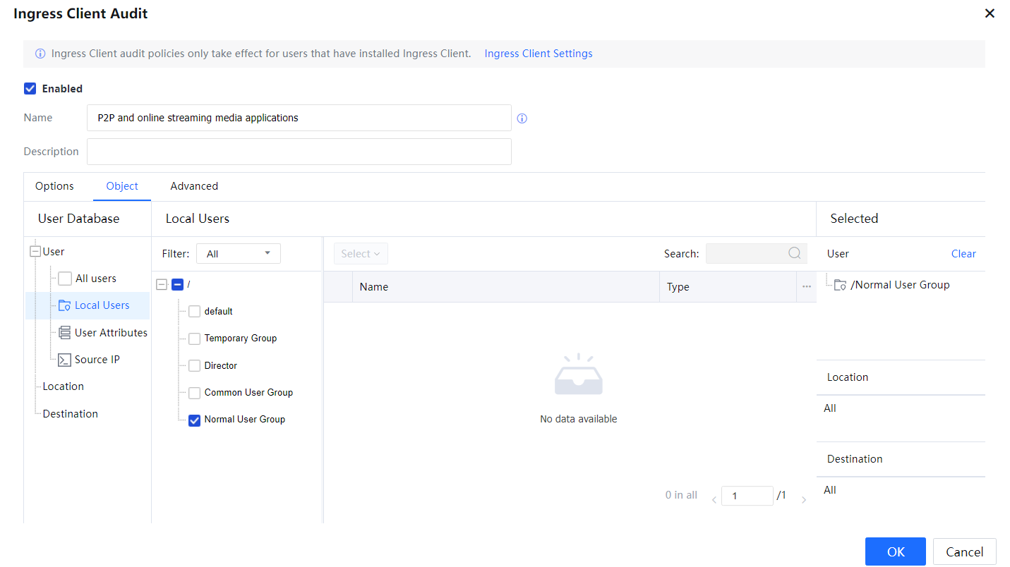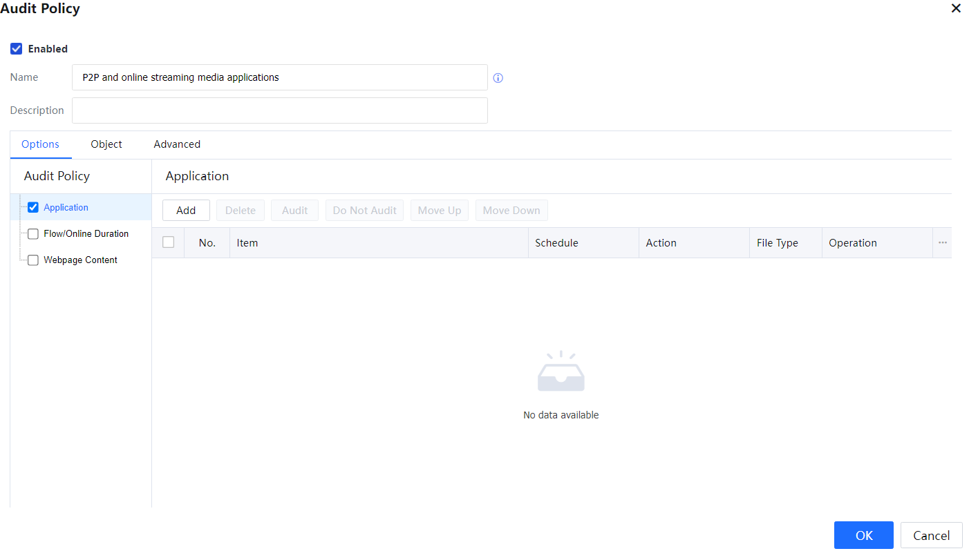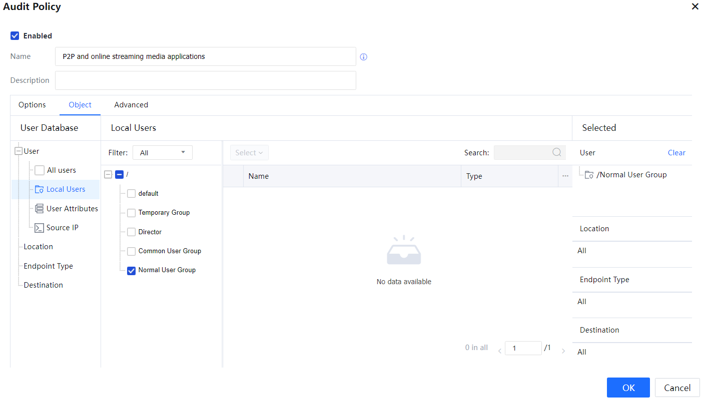 Click OK.[A377] Set the Audit policy for the common user group. Add the policy, select Audit policy, and add audit objects.