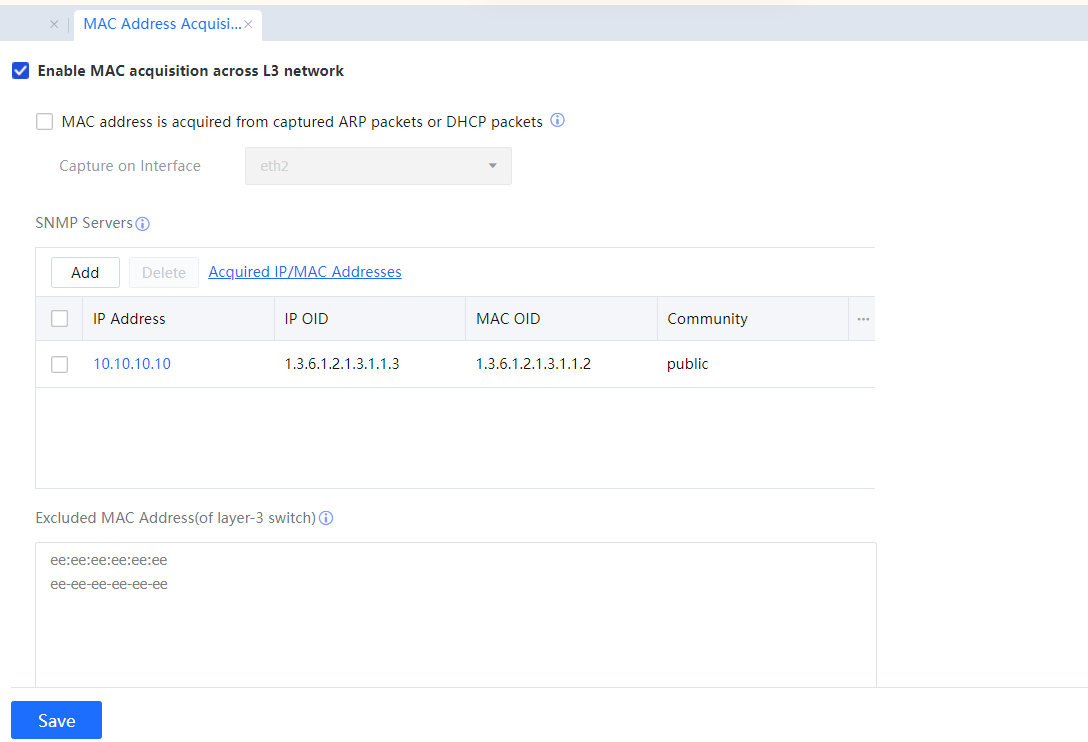 Tick Enable MAC acquisition across L3 network. Select Add and add a server and enter the MAC address of the L3 switch to the exclusion list.