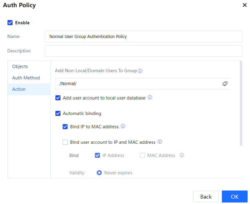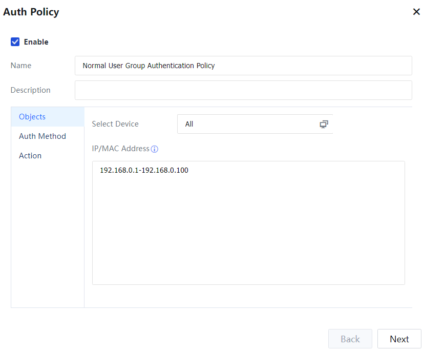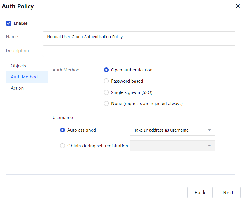 Click Add and set an authentication policy for the common user group. See the following figure.