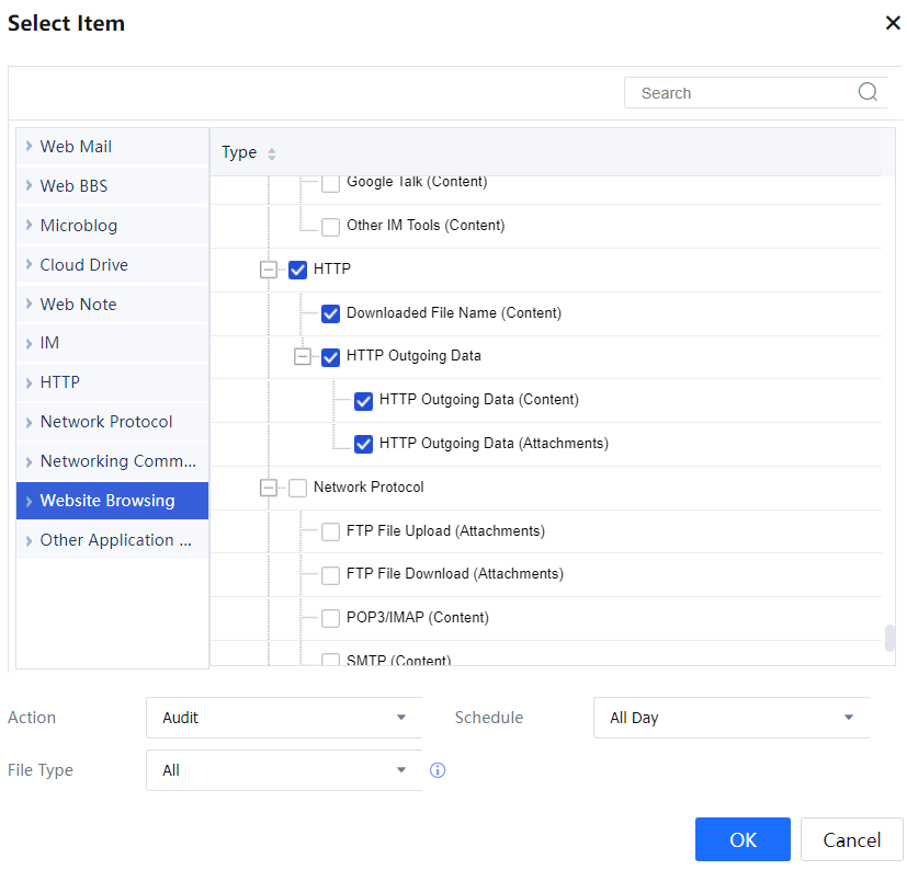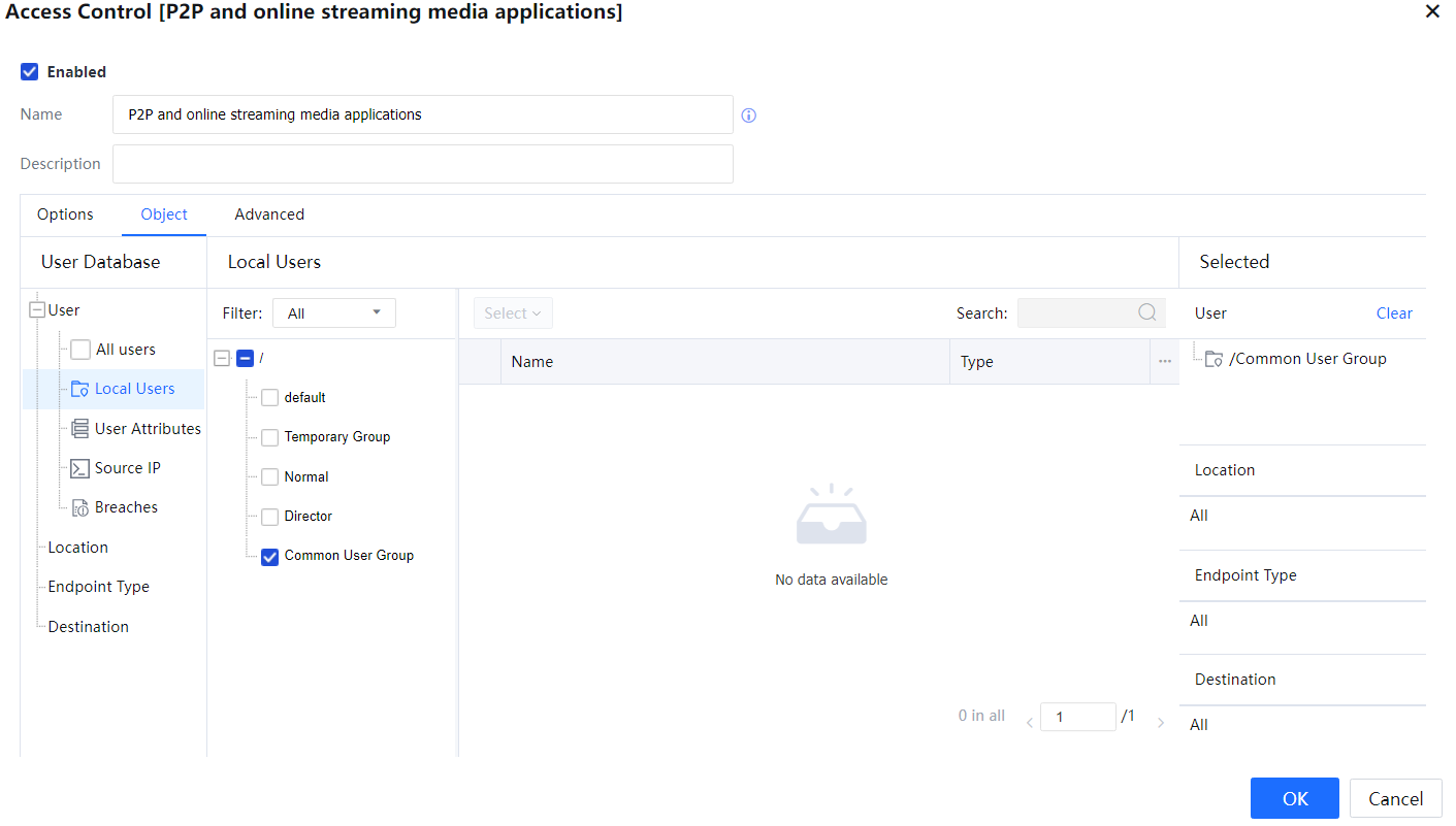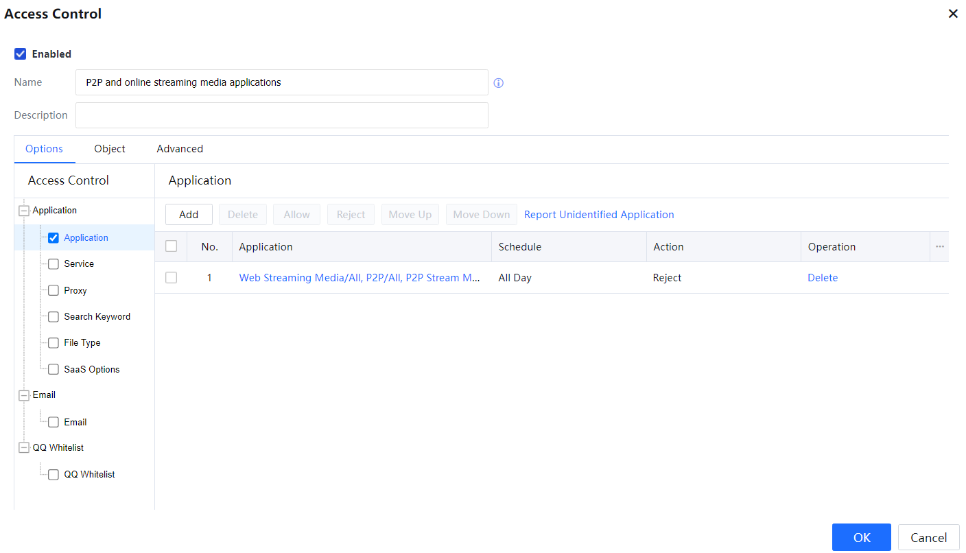 Click Add and select the Internet access policy. Choose Access Control, set access control over P2P and online streaming media applications for office hours, and block access to illegal and unhealthy websites.