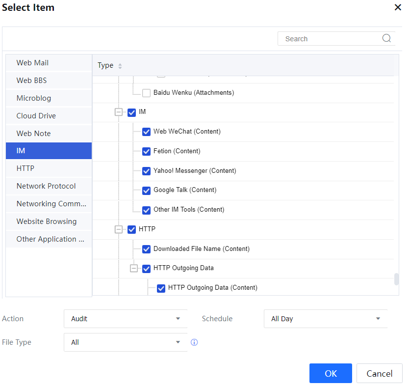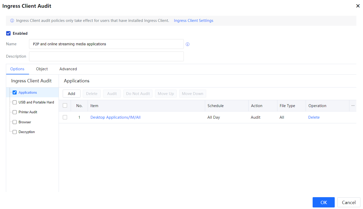 Set the admission policy for the common user group. Add the policy, select Ingress Policy, and enable IM message monitoring.