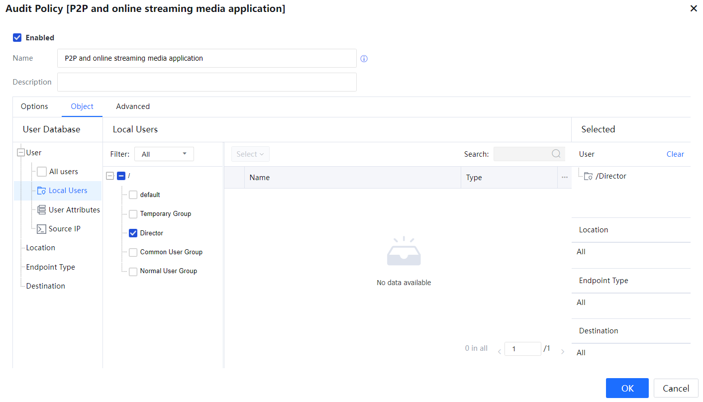 Step 7.Set the Internet access audit policy for the director group. Select Audit Policy and add audit objects.