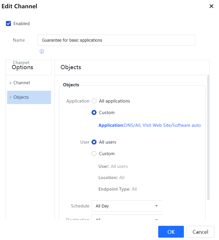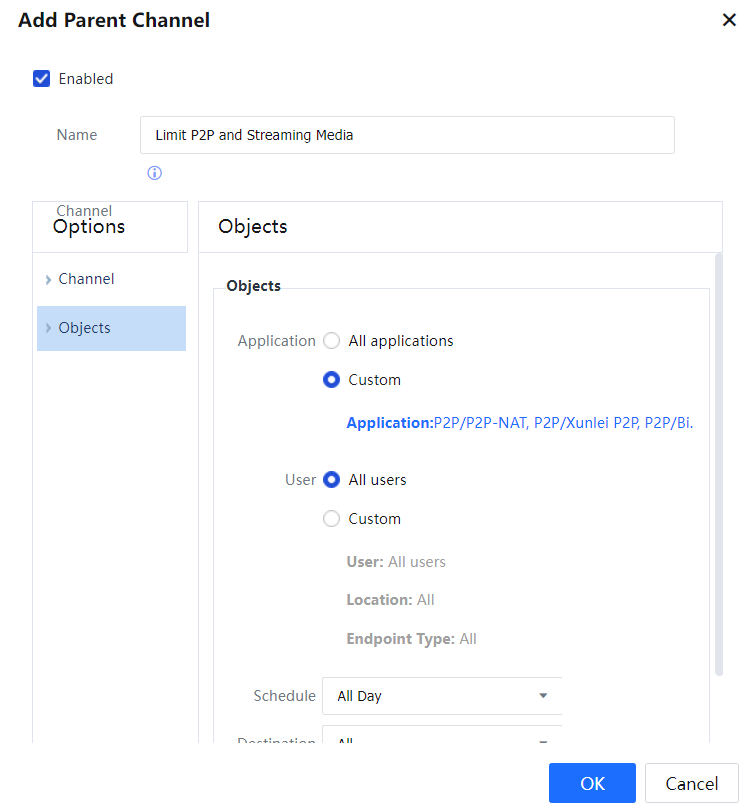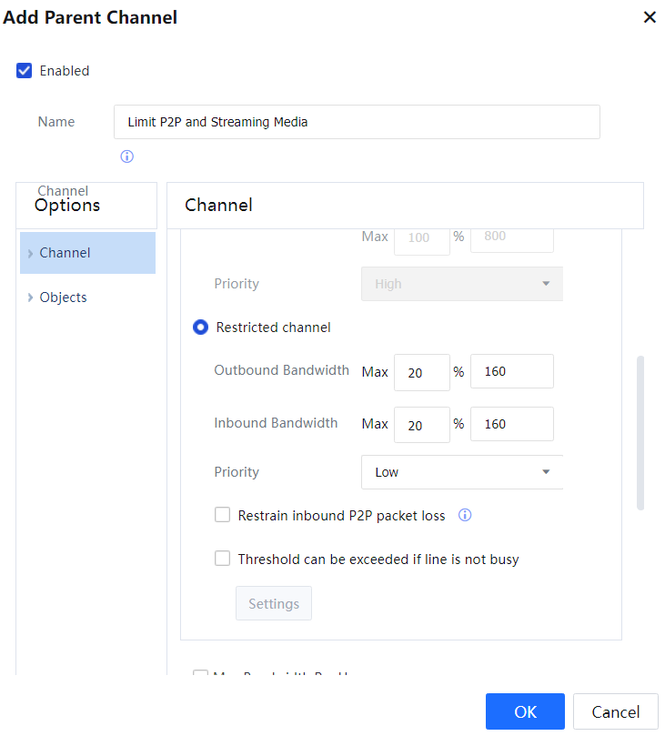 Click Add, select Add Parent Channel, and set the limitation channel for P2P applications, download applications, and streaming media applications.