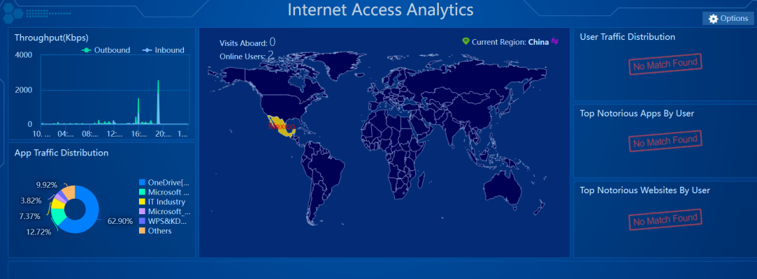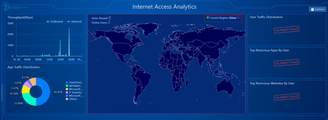Traffic Analytics: It includes user traffic distribution, most active users slideshow, App traffic distribution, and most active Apps.