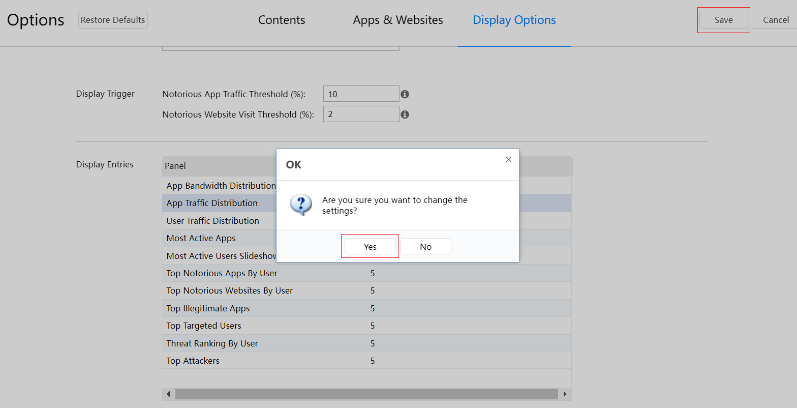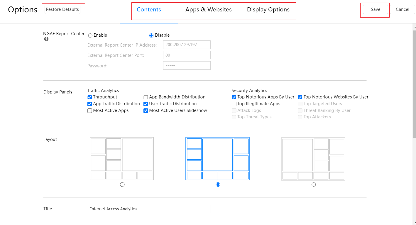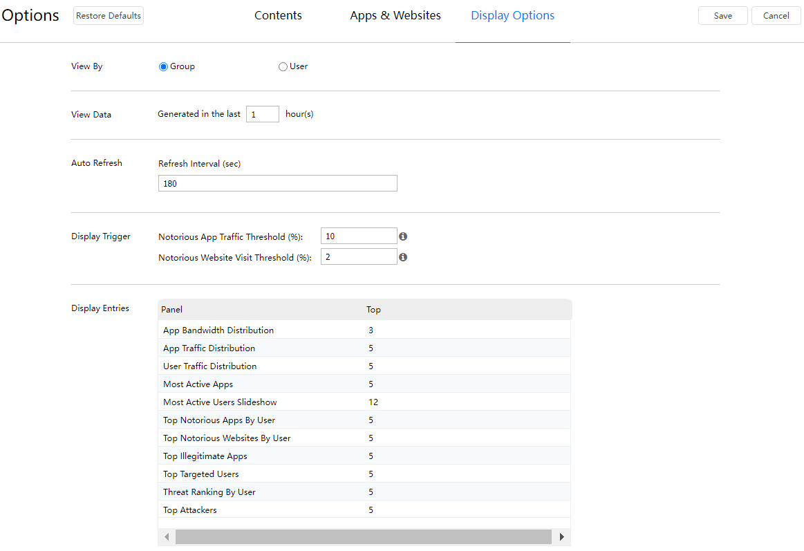 Click Options to enter the Internet Access Analytics configuration page, and set contents of three parts, including Contents, Apps & Websites, and Display Options, to define display contents.