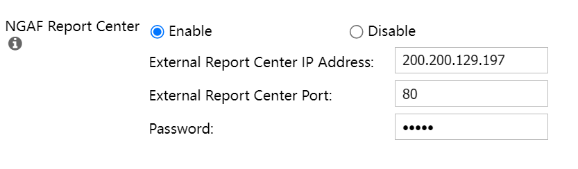 Enabling method: Click Enable, and fill in the External Report Center IP Address, External Report Center Port, and Password.