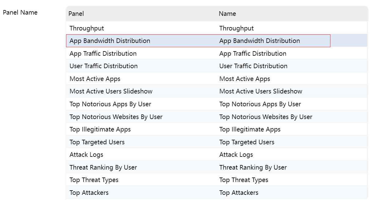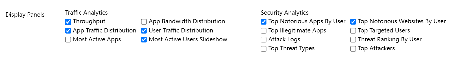 Display Panels: It is divided into Traffic Analytics and Security Analytics. The checked contents will be displayed on the Dashboard page. The more the checked contents, the greater the display density. Selecting a screen with the proper resolution for the display is suggested.