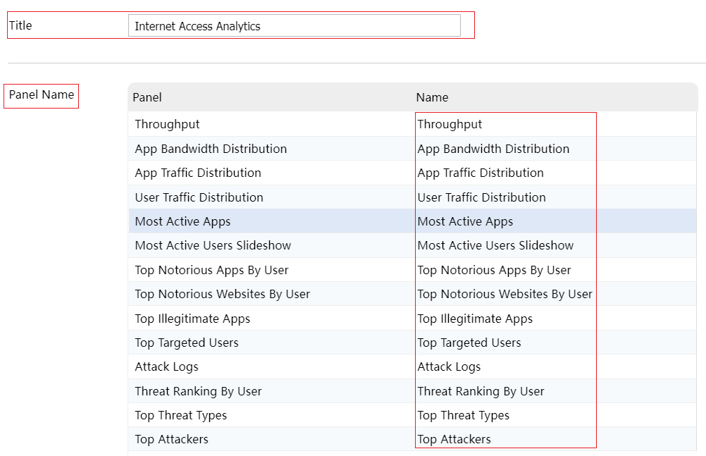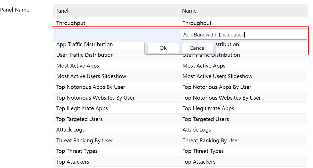 Panel Name: As shown above, define the names of all panels displayed on the Dashboard page. As shown in the following figure, the Panel displays the name of each panel, and double-click the row where a panel needs to be modified to edit the panel name displayed underneath Name; after changing, click OK to save the settings.