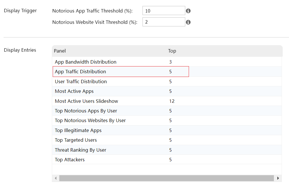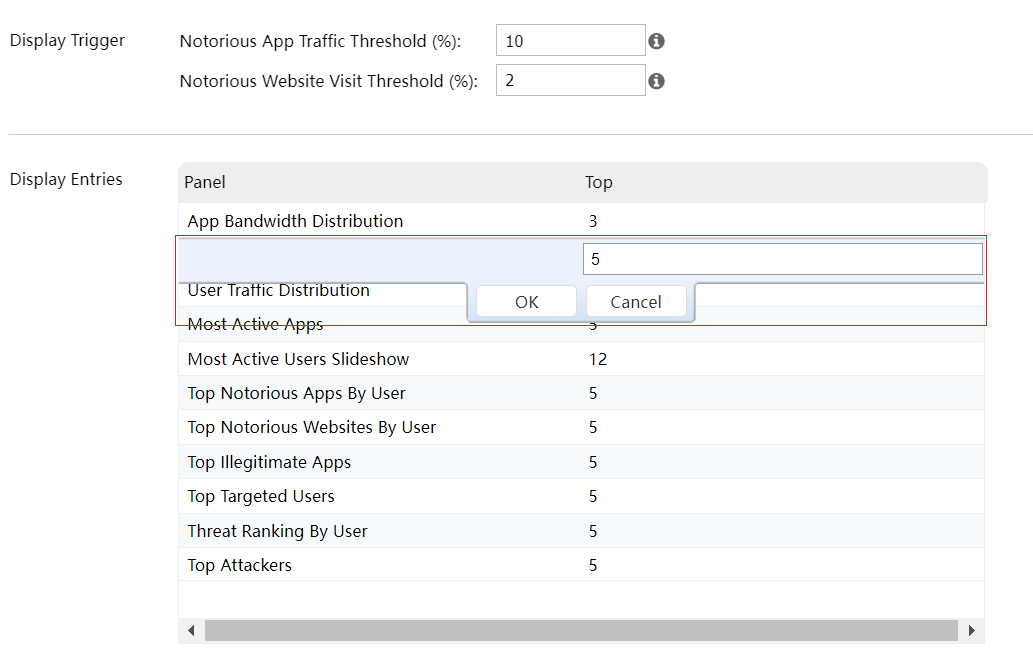 Display Entries: As shown below, define the top number of display objects in each panel on the Dashboard page. Panel: Define the name of each panel, and double-click the row where a panel to be modified is to edit the Top; after changing, click OK to save the settings.
