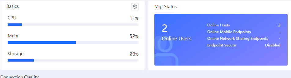 The Basics section displays the overall resource usage of IAG, including the CPU usage, memory usage, and storage usage.
