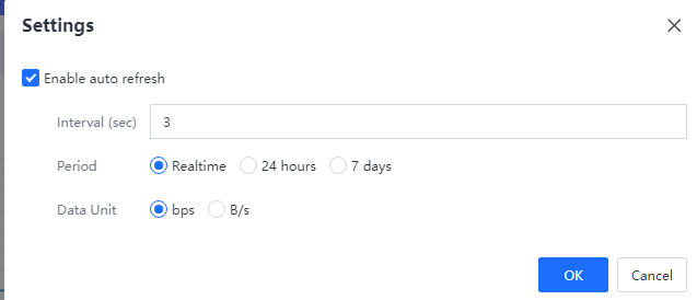 Interval specifies the auto refresh interval. Period specifies the data forwarding conditions of interfaces in the specific time period. Data Unit specifies the traffic unit.