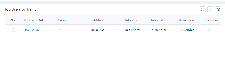 The Top Users by Traffic section displays the top 10 users by traffic. You can rank users by outbound traffic, inbound traffic, or session quantity.