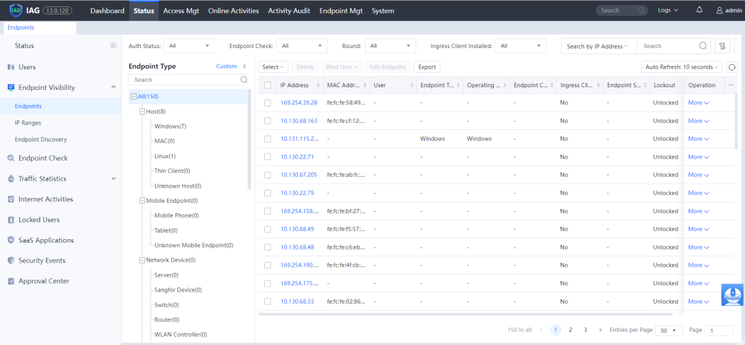 Here you can see all the internal network endpoint IP addresses, MAC addresses, users, groups, endpoint devices, operating systems, first detected time, last login time, and operations.