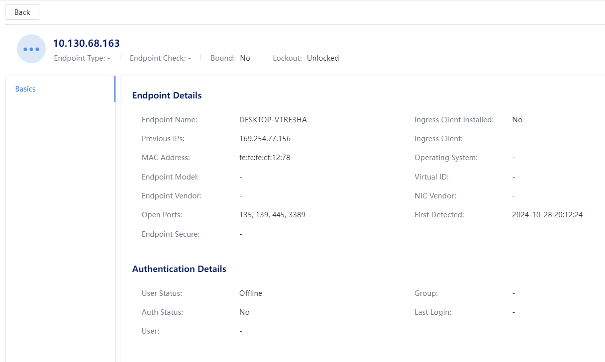 Basic information: including endpoint type, user, group, IP/MAC address information, vendor, operating system, first detected time, last login time, open ports, etc.
