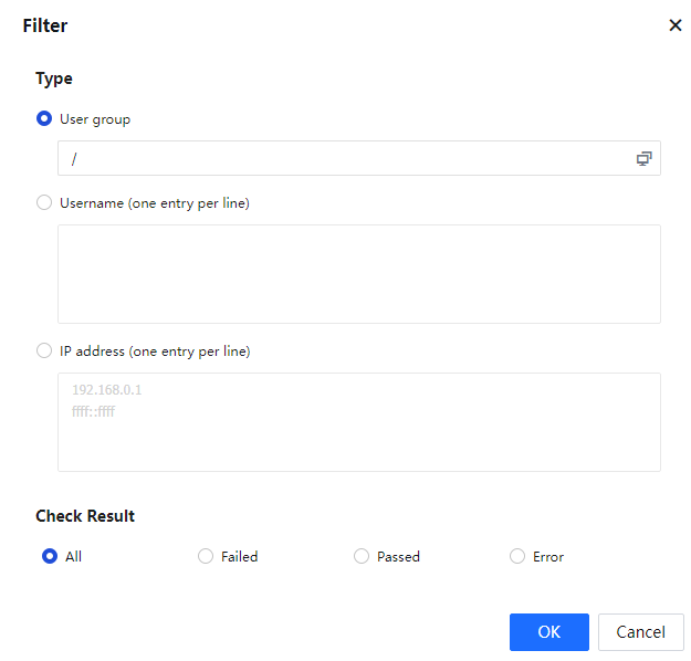 After selecting Object, you can filter according to Username or IP address, enter the specified user and IP, and click OK.