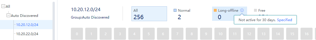 Long-offline: Indicates that this IP has been scanned alive before, but after a certain period (the default is 30 days, configurable, specify the time for long-offline status through the small “i” icon as shown in the figure below) the IP did not scan to be alive, and it will be defined as offline.