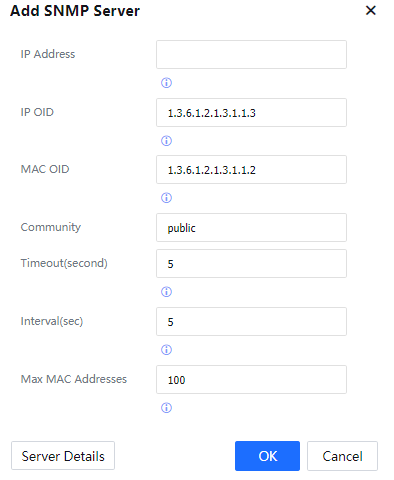 Step 3.Set SNMP Servers to add the information of the Layer 3 switch that needs to obtain the MAC address: