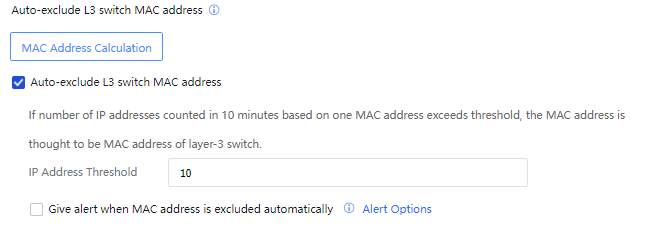 Select Automatically exclude L3 switch MAC address. The device will automatically add MAC addresses that exceed the number of IP records to the MAC address exclusion list according to the set IP address Threshold.