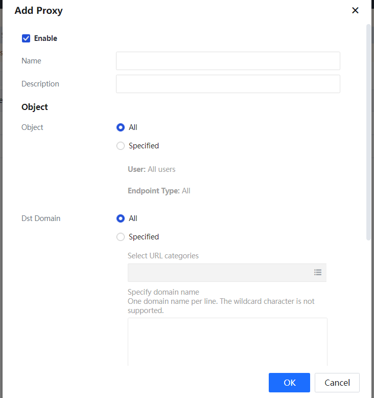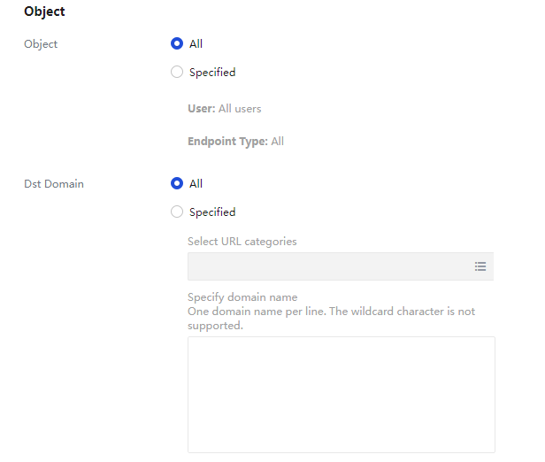 Object: Specify the applicable scope of the HTTP proxy policy. You can specify the applicable scope based on the user range and endpoint type.