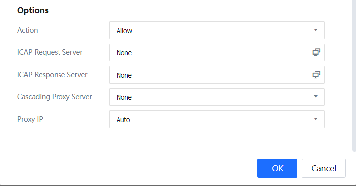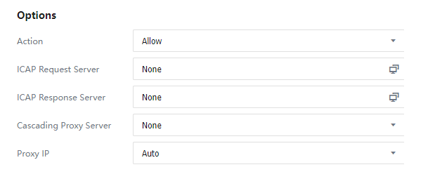 ICAP Server Groups: It determines whether to send data to the ICAP server. You can select None or one or more ICAP server groups. The default value is None, indicating that no data will be sent to the ICAP server. To send data to a specific ICAP server group, select or add that ICAP server group. For more information about the ICAP server group, refer to this chapter's ICAP Server Groups section.[LCH17][18]