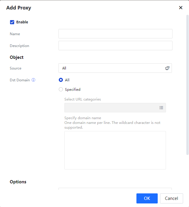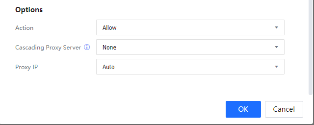 Proxy IP: Specifies the IP address of the outgoing interface that proxy data go through. If you select Auto, the proxy IP address will be automatically chosen. You can also select a specific IP address from the pull-down list. In the list, there are IP addresses of VLAN interfaces, WAN interfaces, bridge interfaces, DMZ interfaces, and the interfaces for Single Arm mode (exclusive of IP addresses of LAN interfaces).[LCH22][23]