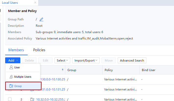 Step 1.Select the user group that needs to add a subgroup in the local users and enter the management interface on the right. Next, click the Add button in the member list and select the new type of Group.