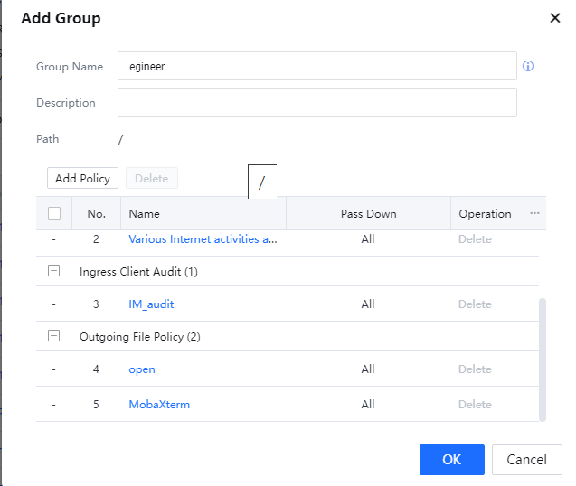 By default, there will be a built-in group of the device, which is the root group, this group cannot be deleted, and the group name cannot be modified. The newly added groups are all subgroups of the root group. The root group is the first-level group, the newly added group under the root group is the second-level group, and so on. The local group supports up to 16 levels of organizational structure, including the root group. This design aligns more with the company's organizational structure and facilitates management. For example: Add an engineer group under the root group.