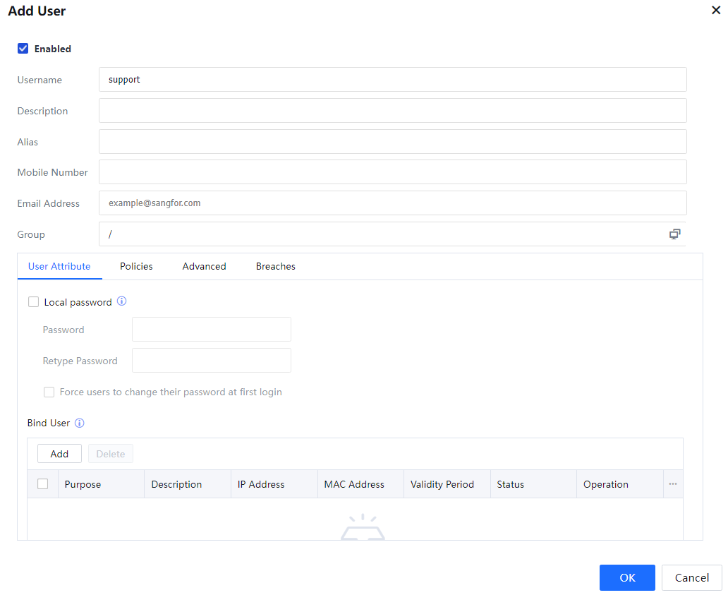 Step 5.The administrator clicks Add under Bind User to bind information such as IP and MAC.
