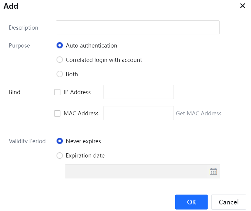 New user binding: To set the binding relationship between user IP and MAC. Fill in the description, binding purpose, binding object, and binding validity period. The binding purpose can select auto authentication, correlated login with an account, and Both. Fill in the bound IP and MAC in the binding object.